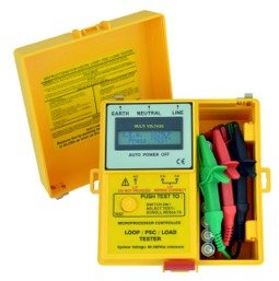 ● Microprocessor-controlled. ● Measures the voltage drop as if 16A was flowing between Line and Neutral. ● Displays voltage without current (V at 0A). ● Display voltage as if 16A flowing between Line and Neutral (V at 16A). ● Loop test for L-E ● PSC between L-N. ● Single one smart push button operation; ON, Scroll through results and menus. ● Checks wiring integrity (LEDs). ● Auto off/auto ranging (software range). ● Combined prospective short circuit current, loop and load tester. ● Display can be customized for large orders.